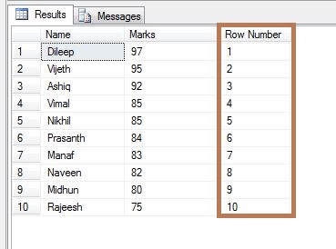 select Name,Marks, Row_Number() over(order by Marks desc) As 'Row Number' From dbo.Table_MarkList