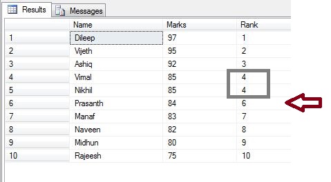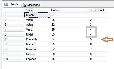 select Name,Marks, DENSE_RANK() over(order by Marks desc) As 'Dense Rank' From dbo.Table_MarkList