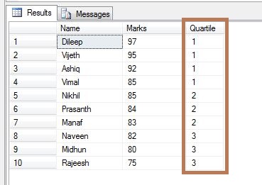 select Name,Marks, NTILE(3) over(order by Marks desc) As 'Quartile' From dbo.Table_MarkList