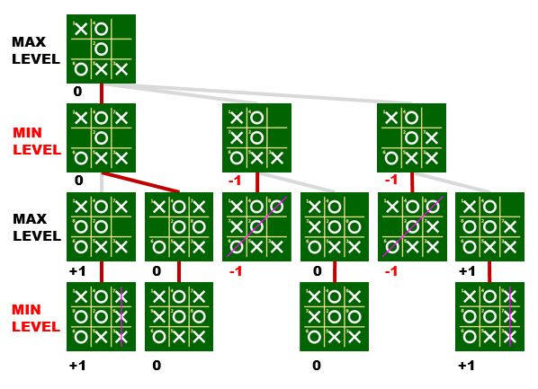 Minimax is a basic method to search game trees. The second tic-tac-toe program uses minimax. It calculates score for every node (game position): +1 means X wins, -1 means O wins, 0 means draw. X is max level player to maximize the score. O is min level player to minimize the score.