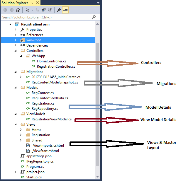 The appsetting JSON file contains the LocalDB connection string details in our Application and we have given the database name as "RegDB". If you want to know more about JSON file configuration in ASP.NET Core, please check our previous article ASP.NET Core 1.0: Adding A Configuration Source File.
