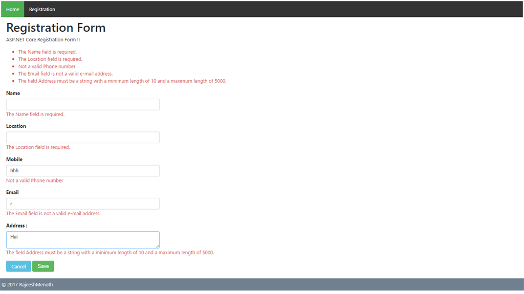 We used latest ASP.NET Core Tag Helpers in Registration page to access controller and actions, validation etc.