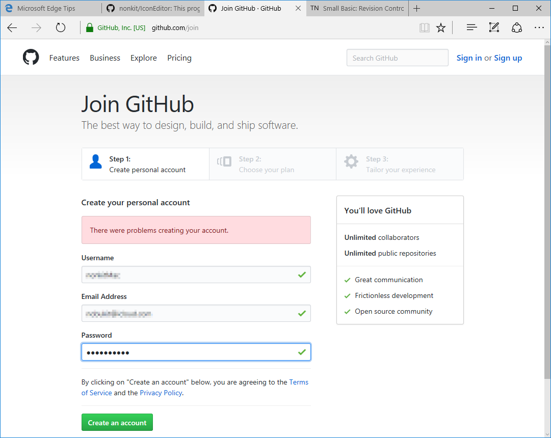 Confirm your user name, email address and password. Then push [Create an account] button.
