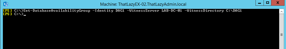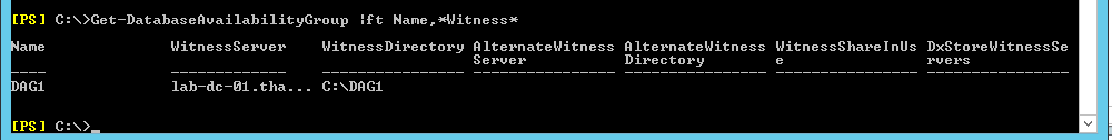 1.Set-DatabaseAvailabilityGroup -Identity DAG1 -WitnessServer LAB-DC-01 -WitnessDirectory C:\DAG1