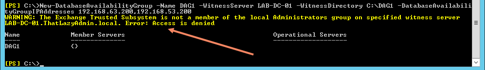 If you receive the following WARNING: "The Exchange Trusted Subsystem is not a member of the local Administrator group on a specified witness server. Error: Access is denied