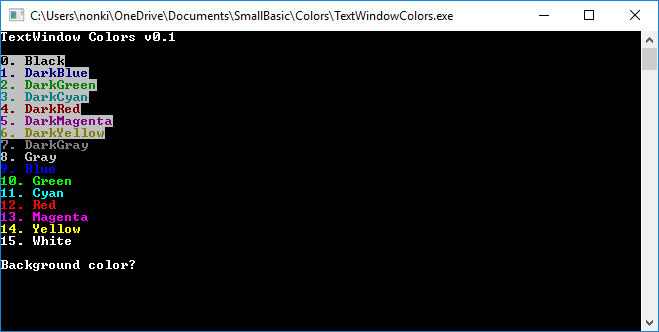 - TextWindow Colors v0.1 - shows 16 foreground/background colors.