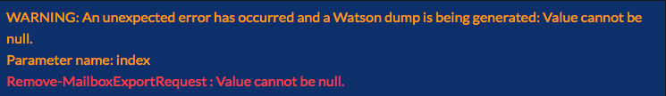 Now when you run the command to remove the mailbox export requests it should go through without error.