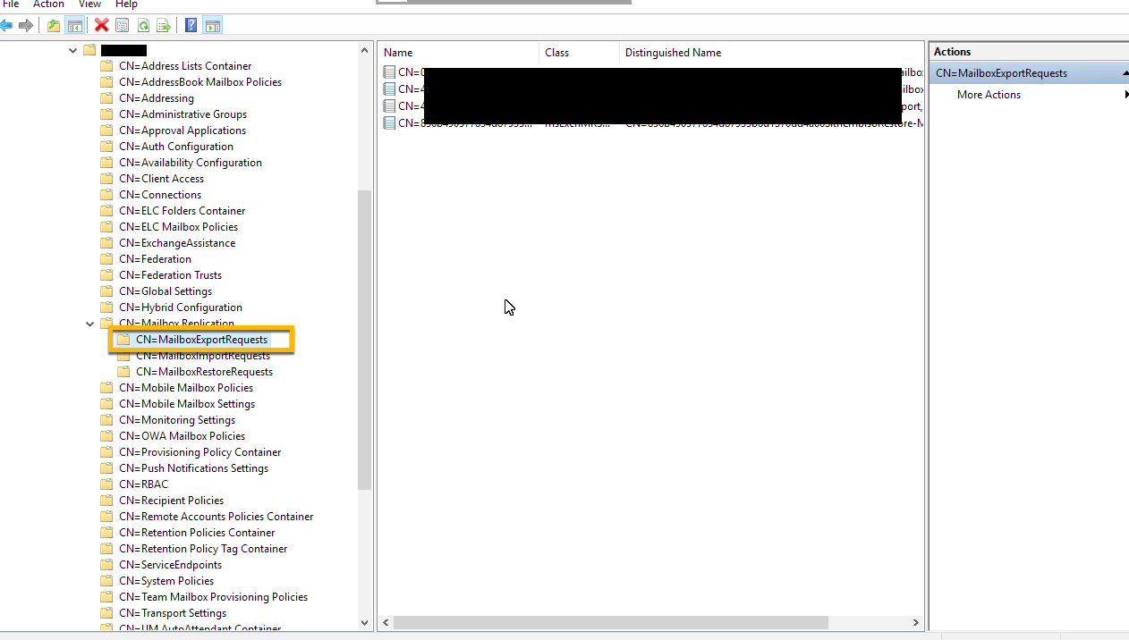 To find this mailbox export requests, you need to launch ADSIEdit and perform the following:
