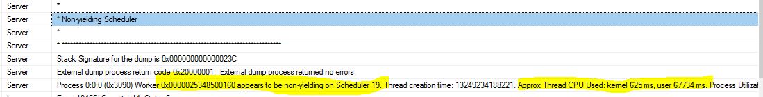 The reason for this type of error condition to happen varies quite a bit, and it can range from CPU scheduling problems, issues with RAM chips, very heavy IO latency, linked server drivers, etc. In the worst case, the stack dumps can cause serious system instability and can trigger cluster failovers or SQL Server service restarts. In this blog post, we’re going to focus on analyzing the somewhat common condition of the Non-Yielding scheduler.