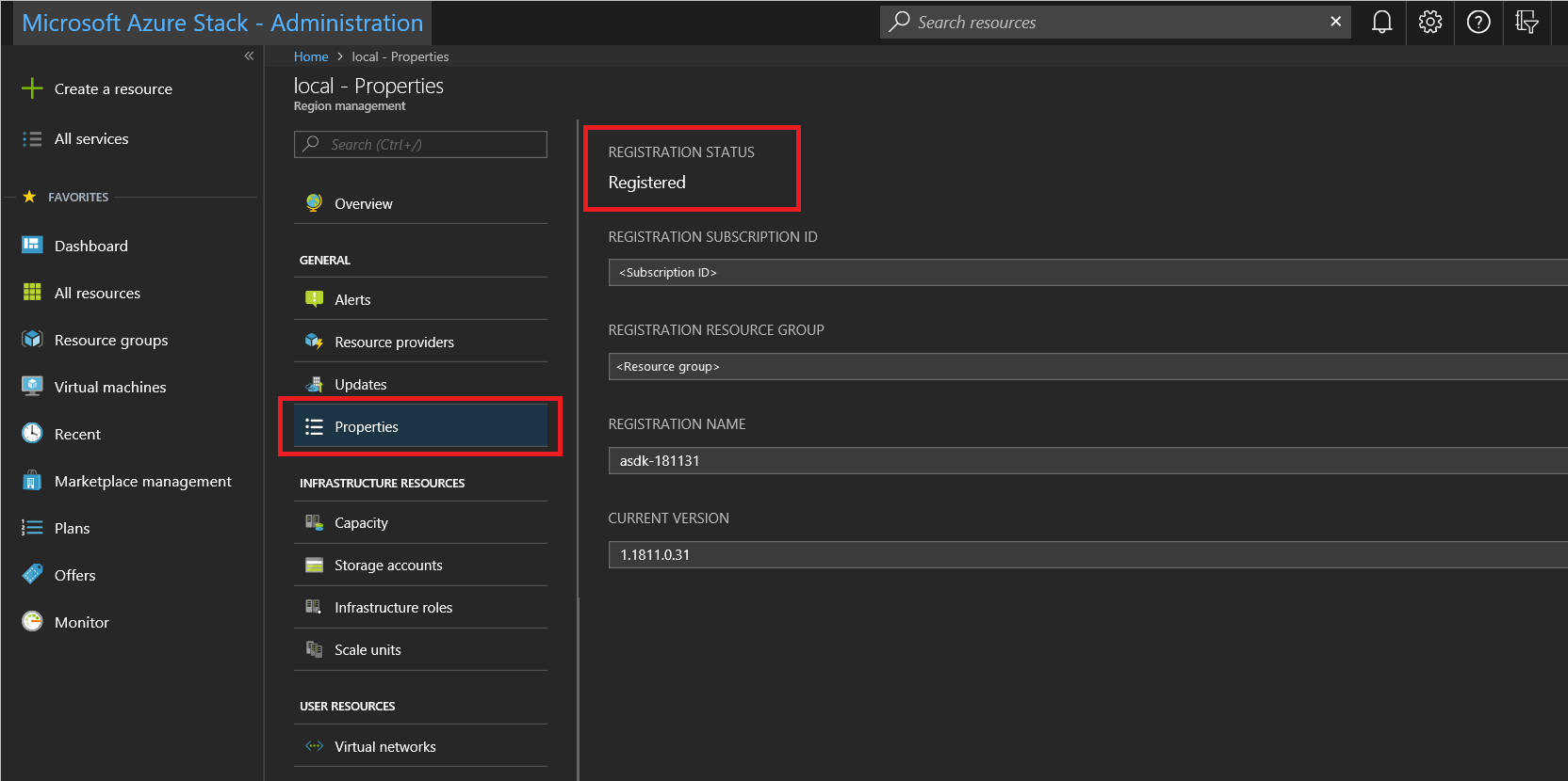 You can use the Region management tile to verify that the Azure Stack Hub registration was successful. This tile is available on the default dashboard in the administrator portal. The status can be registered, or not registered. If registered, it also shows the Azure subscription ID that you used to register your Azure Stack Hub along with the registration resource group and name.