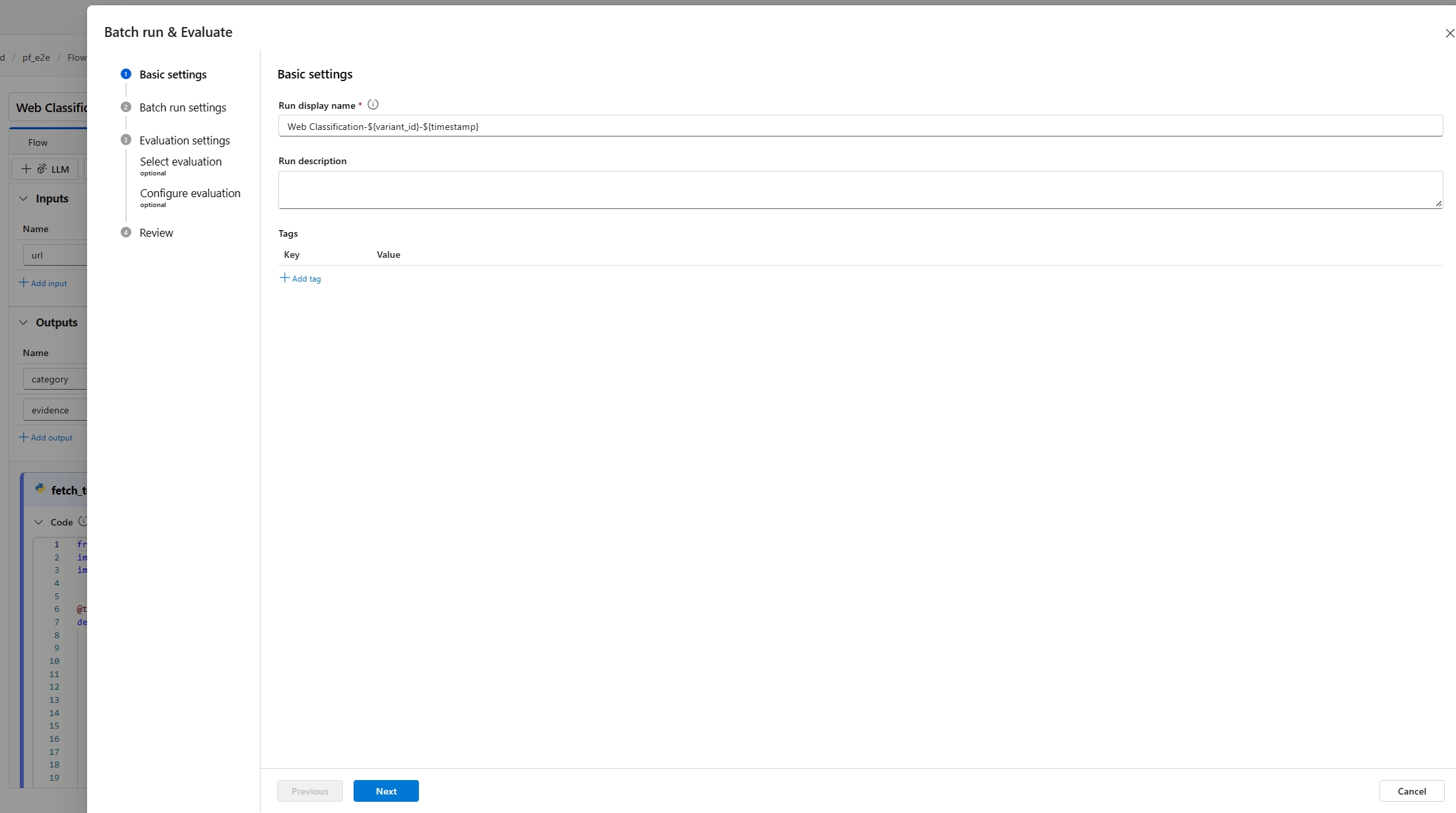 First, you're asked to give your batch run a descriptive and recognizable name. You can also write a description and add tags (key-value pairs) to your batch run. After you finish the configuration, select Next to continue.