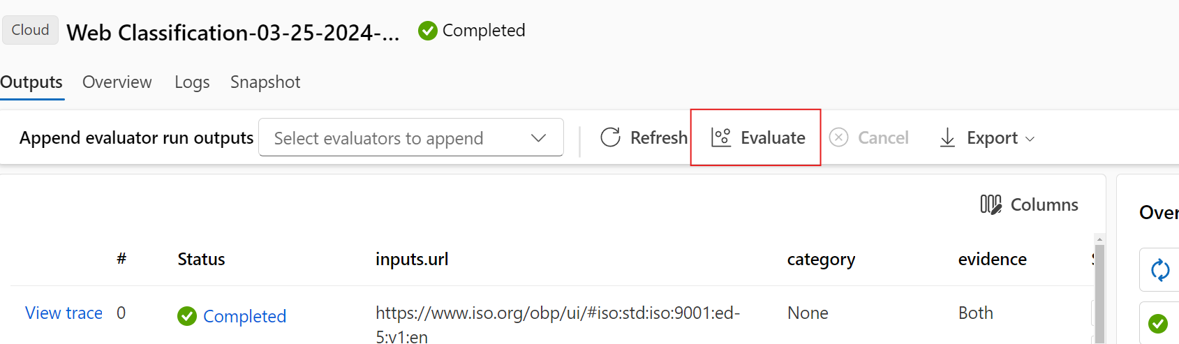 Selecting Append evaluation output allows you to select related evaluation runs and you see appended columns at the end of the table showing the evaluation result for each row of data. Multiple evaluation outputs can be appended for comparison.
