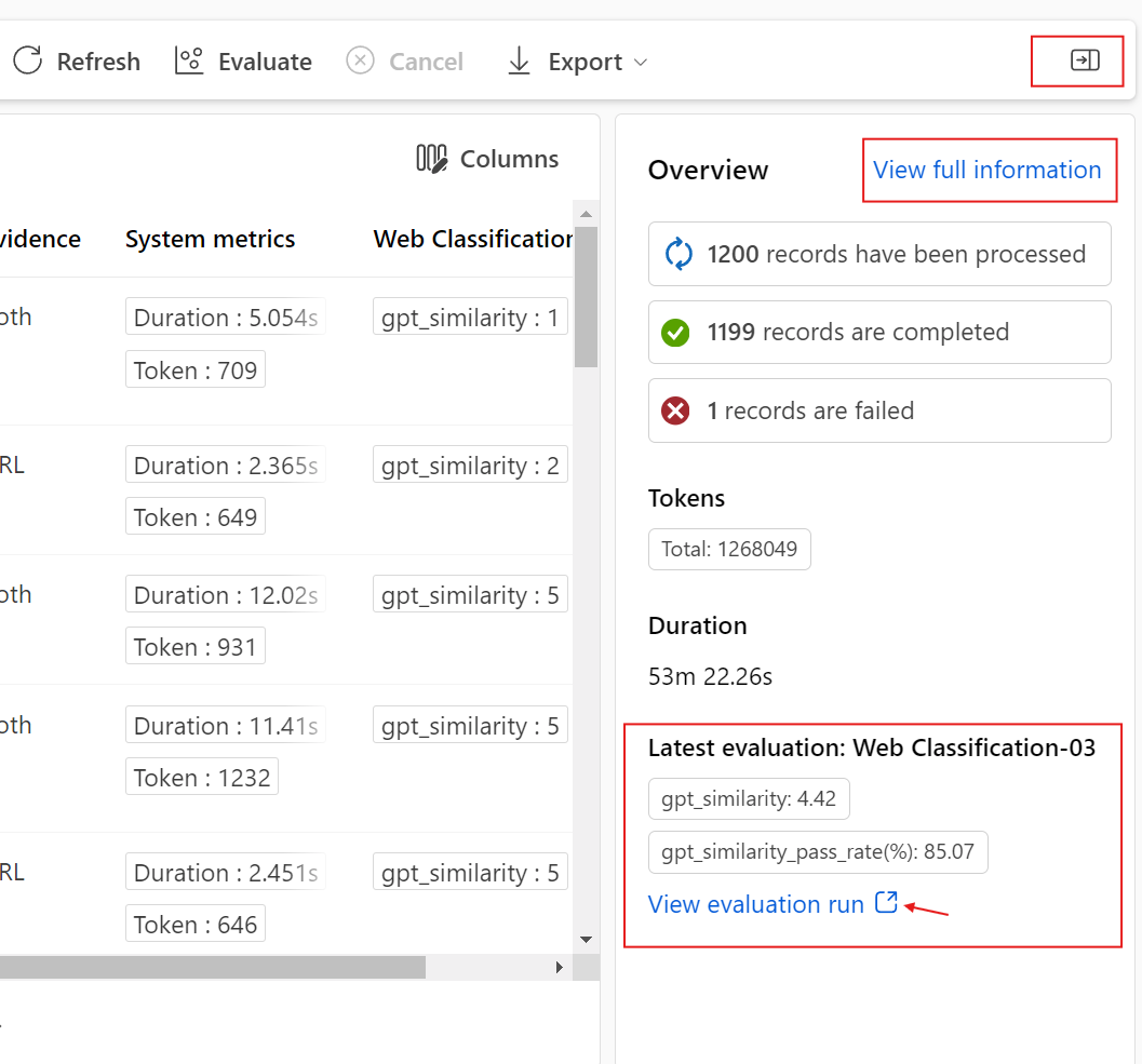 If you have already completed a batch run, you can start another round of evaluation to submit a new evaluation run to calculate metrics for the outputs without running your flow again. This is helpful and can save your cost to rerun your flow when: