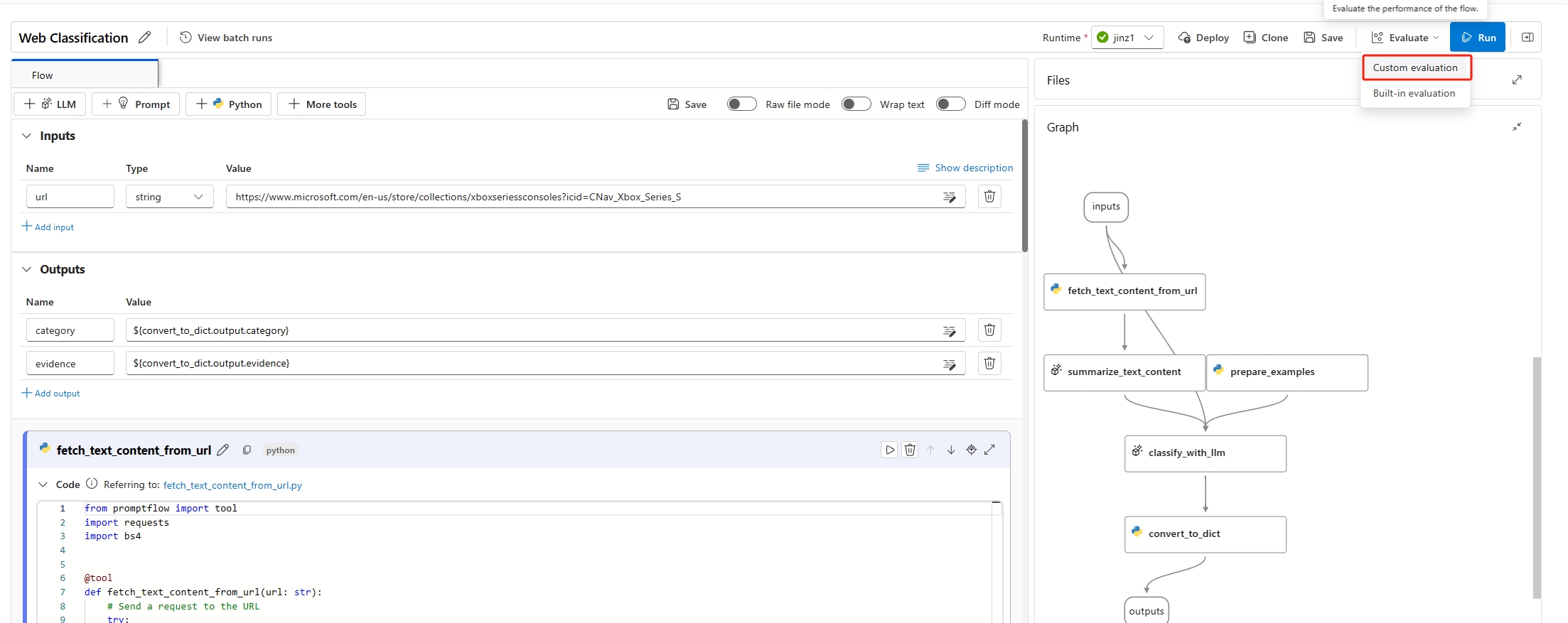 To start a batch run with evaluation, you can select on the Evaluate button - Custom evaluation. By selecting Custom evaluation, you can submit either a batch run with evaluation methods or submit a batch run without evaluation for your flow.