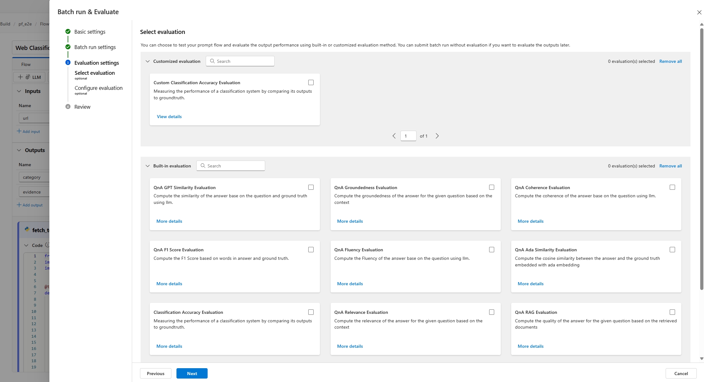 Then, in the next step, you can decide to use an evaluation method to validate the performance of this flow. You can directly select the Next button to skip this step if you don't want to apply any evaluation method or calculate any metrics. Otherwise, if you want to run batch run with evaluation now, you can select one or more evaluation methods. The evaluation starts after the batch run is completed. You can also start another round of evaluation after the batch run is completed. To learn more about how to start a new round of evaluation, see Start a new round of evaluation.