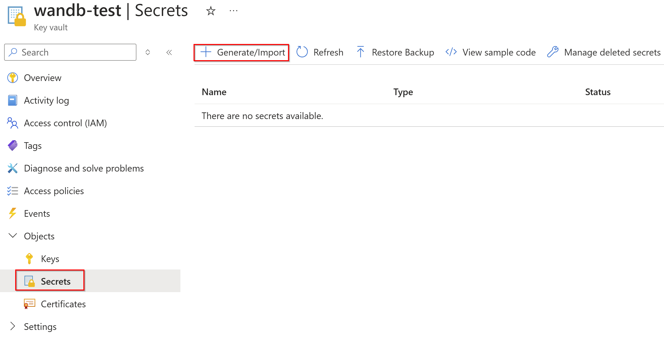 From within your key vault resource under Objects, select Secrets > Generate/Import.