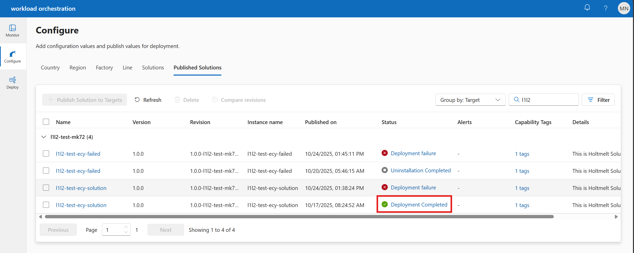 The Published Solutions sub-tab shows the list of solutions which were authored and published to targets. This implies that the solutions are ready to be deployed.
