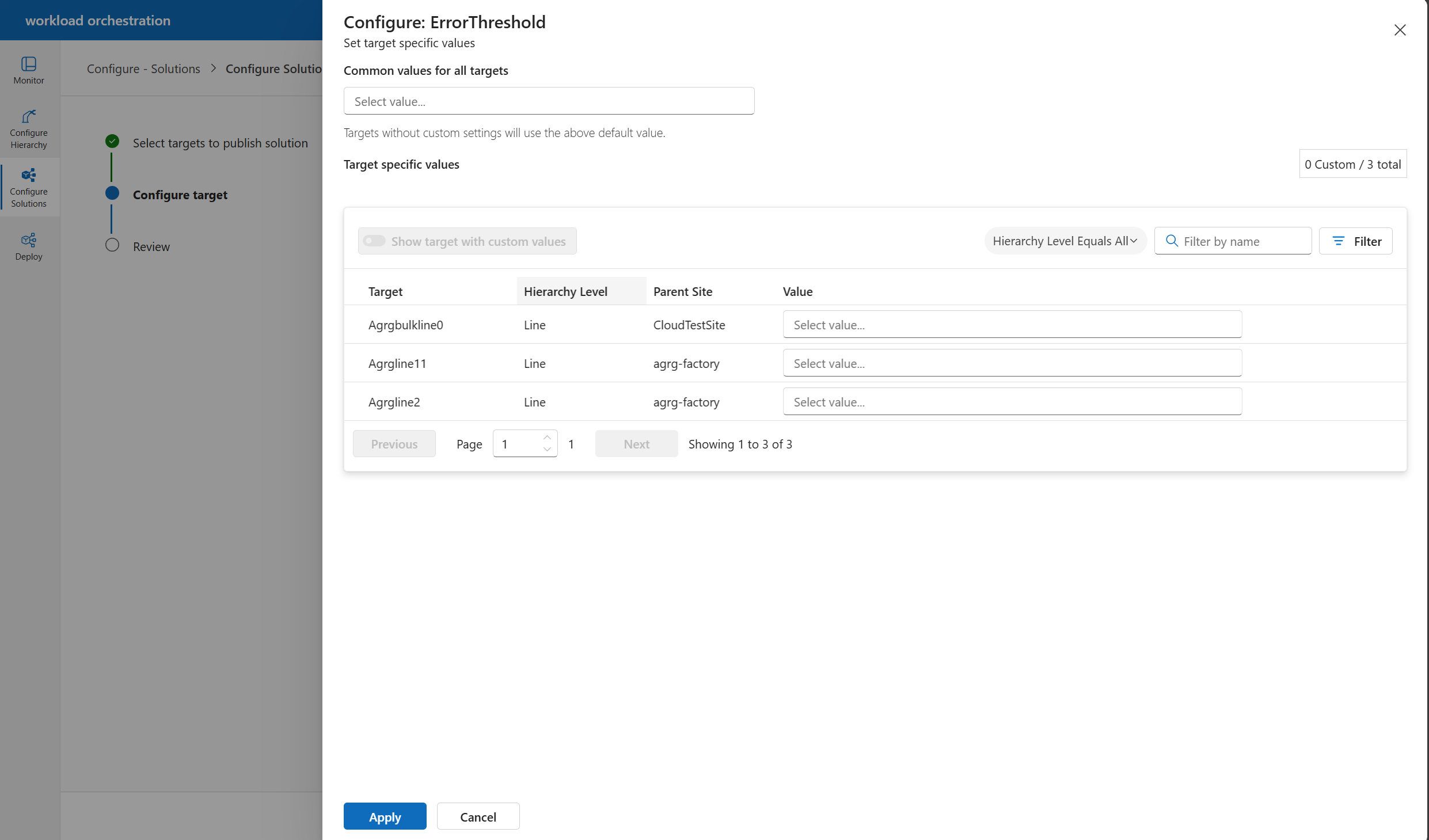 You can set common configuration parameters for a target or any hierarchy level (for example, region, factory, etc.) from the Configure Hierarchy tab. The following example demonstrates the process for a factory: