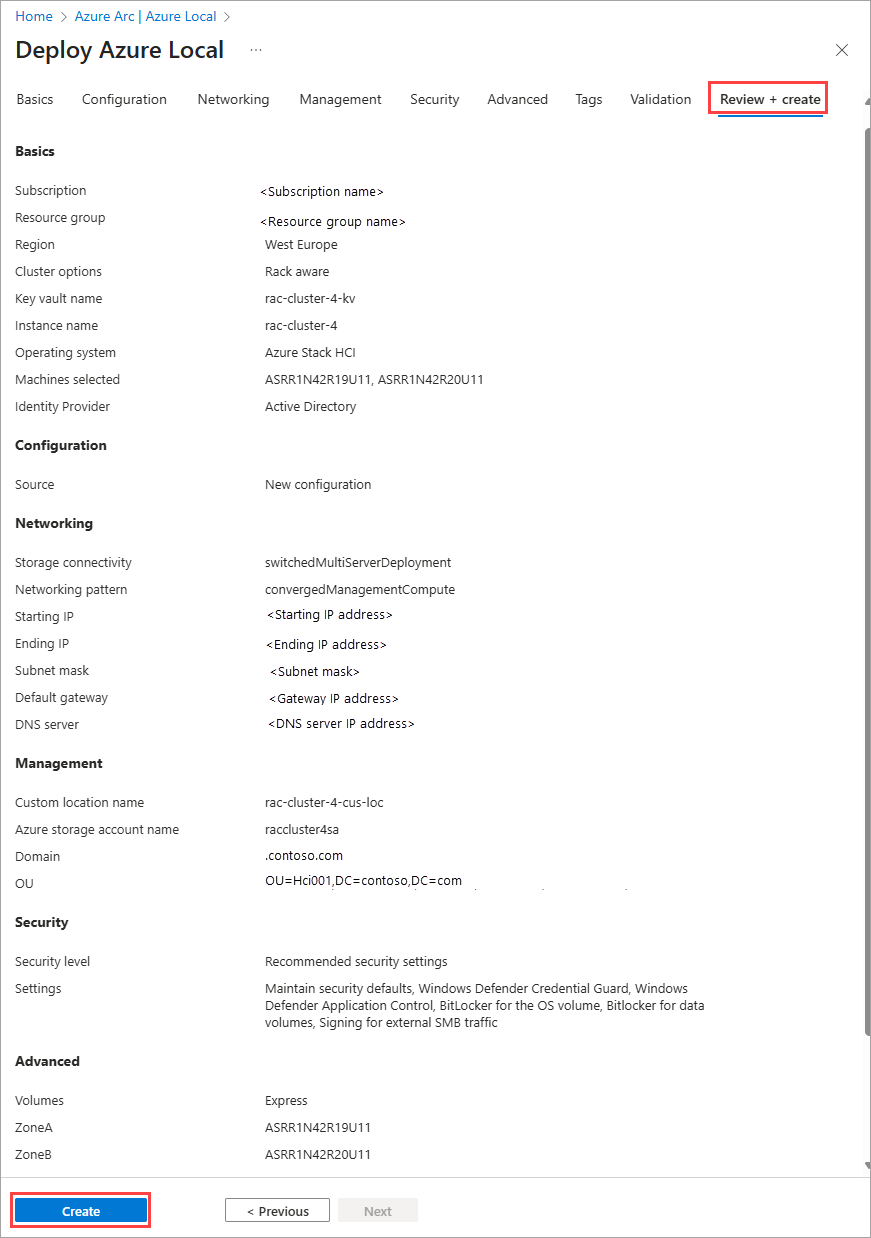 To deploy a rack aware cluster, follow the steps to Deploy an Azure Local instance via the Azure portal. In general, the steps are similar to deploying a standard single cluster. The differences are highlighted in the next sections.