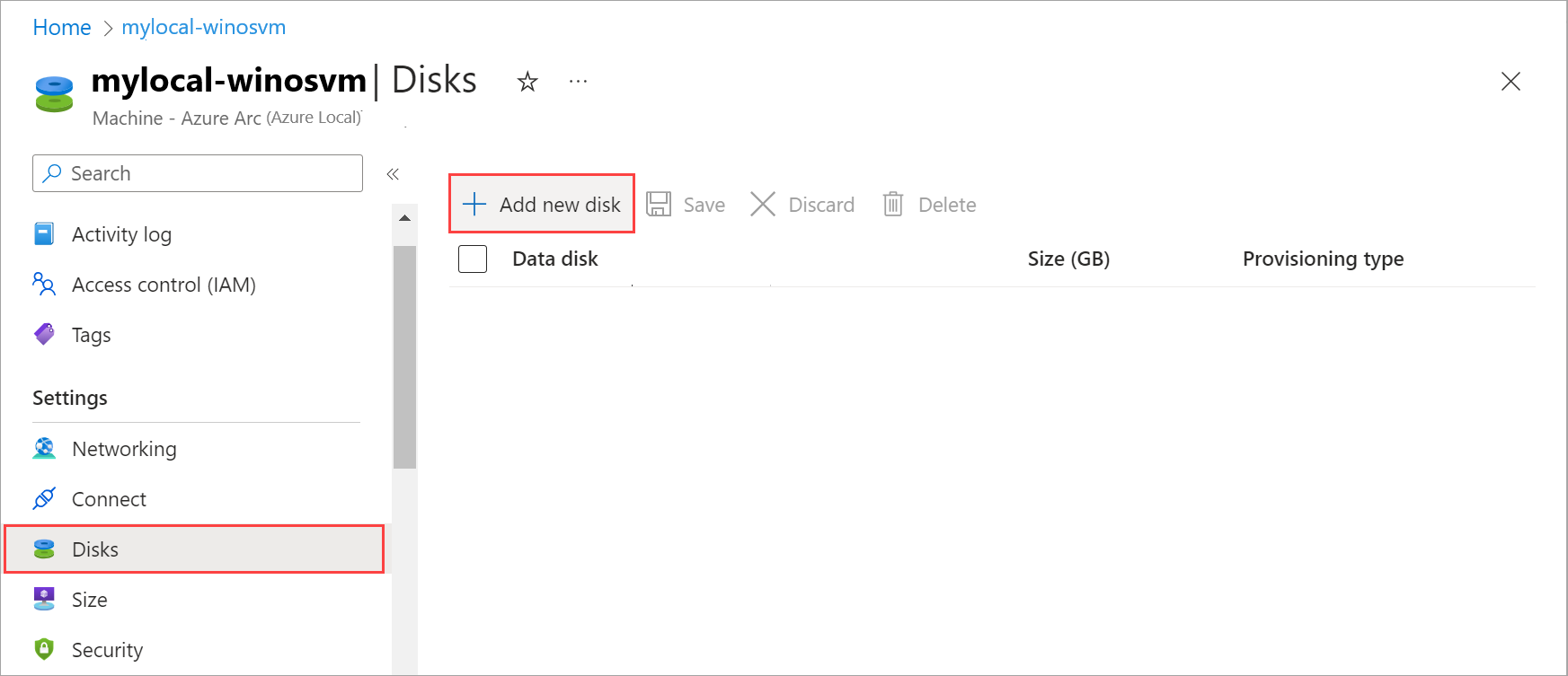 To add a data disk, you first create a disk and then attach it to the VM. Run the following commands in the Azure CLI on the computer that you're using to connect to Azure Local.