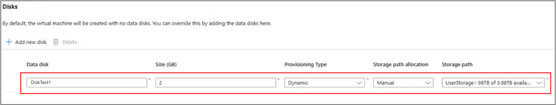 Create a data disk (dynamic) on a specified storage path: