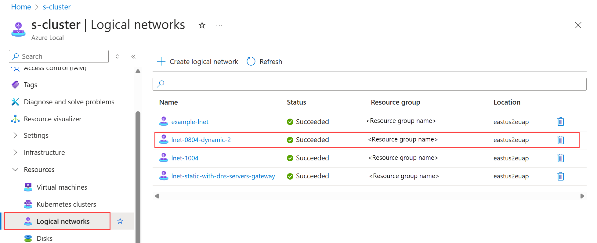 { "extendedLocation": { "name": "/subscriptions/<Subscription ID>/resourcegroups/examplerg/providers/microsoft.extendedlocation/ customlocations/examplecl", "type": "CustomLocation" }, "id": "/subscriptions/<Subscription ID>/resourceGroups/examplerg/providers/Microsoft.AzureStackHCI/logicalNetworks/static-lnet3", "location": "eastus", "name": "static-lnet3", "properties": { "dhcpOptions": { "dnsServers": [ "100.71.93.111" ] }, "provisioningState": "Succeeded", "status": { "errorCode": "", "errorMessage": "", "provisioningStatus": null }, "subnets": [ { "name": "static-lnet3", "properties": { "addressPrefix": "100.78.98.0/24", "addressPrefixes": null, "ipAllocationMethod": "Static", "ipConfigurationReferences": null, "ipPools": [ { "end": "100.78.98.255", "info": { "available": "256", "used": "0" }, "ipPoolType": null, "name": null, "start": "100.78.98.0" } ], "networkSecurityGroup": { "id": "/subscriptions/<Subscription ID>/resourceGroups/examplerg/providers/Microsoft.AzureStackHCI/networkSecurityGroups/examplensg3", "resourceGroup": "examplerg" }, "routeTable": { "etag": null, "name": null, "properties": { "routes": [ { "name": null, "properties": { "addressPrefix": "0.0.0.0/0", "nextHopIpAddress": "100.78.98.1" } } ] }, "type": null }, "vlan": 301 } } ], "vmSwitchName": "ConvergedSwitch(managementcompute)" }, "resourceGroup": "examplerg", "systemData": { "createdAt": "2025-03-13T01:04:07.645689+00:00", "createdBy": "gus@contoso.com", "createdByType": "User", "lastModifiedAt": "2025-03-13T01:04:15.389109+00:00", "lastModifiedBy": "319f651f-7ddb-4fc6-9857-7aef9250bd05", "lastModifiedByType": "Application" }, "tags": null, "type": "microsoft.azurestackhci/logicalnetworks" }