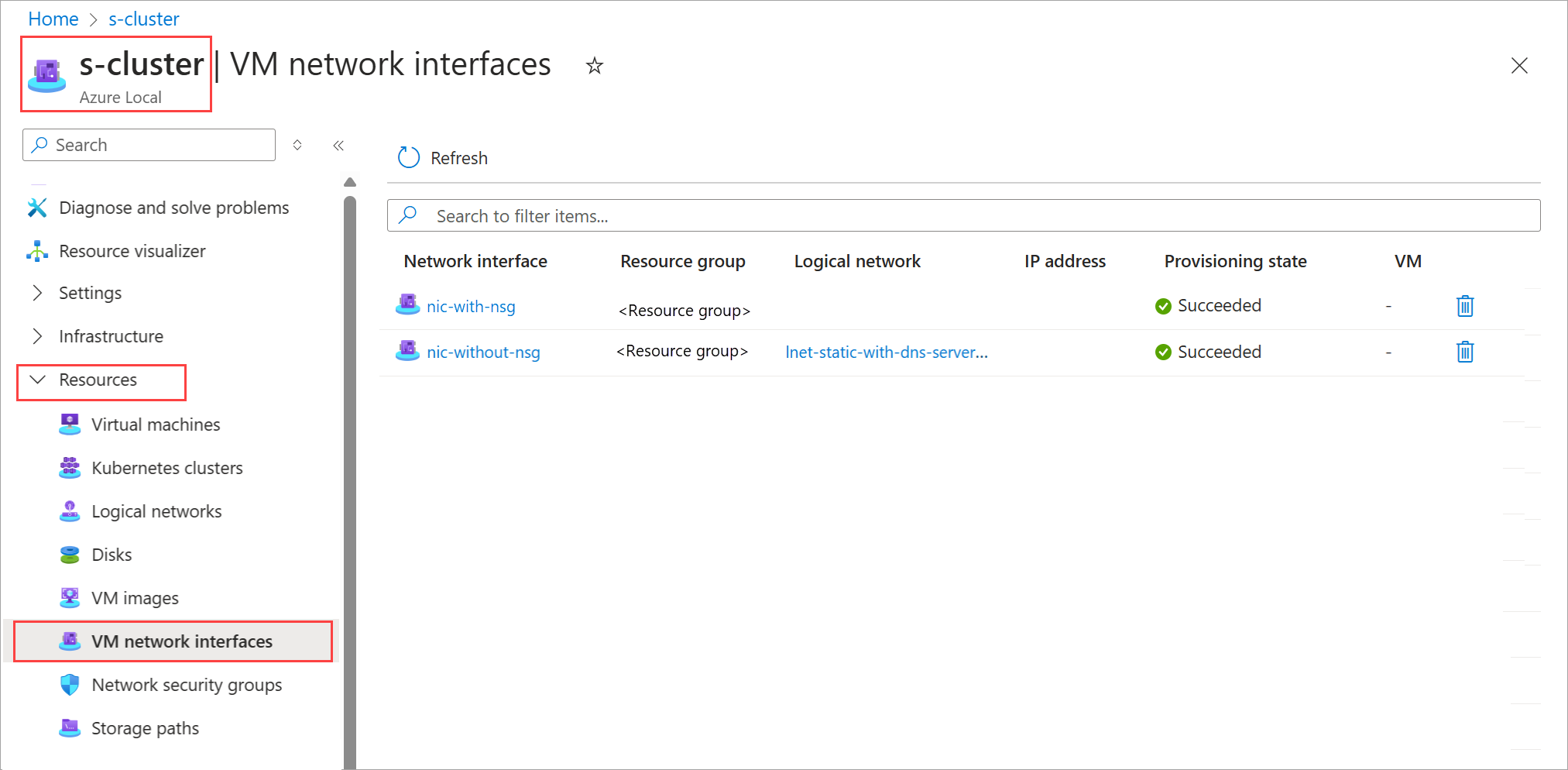 { "extendedLocation": { "name": "/subscriptions/<Subscription ID>/resourcegroups/examplerg/providers/microsoft.extendedlocation/customlocations/examplecl", "type": "CustomLocation" }, "id": "/subscriptions/<Subscription ID>/resourceGroups/examplerg/providers/Microsoft.AzureStackHCI/networkInterfaces/examplenic", "location": "eastus", "name": "examplenic", "properties": { "dnsSettings": null, "ipConfigurations": [ { "name": null, "properties": { "gateway": "100.78.98.1", "prefixLength": "24", "privateIpAddress": "100.78.98.224", "subnet": { "id": "/subscriptions/<Subscription ID>/resourceGroups/examplerg/providers/Microsoft.AzureStackHCI/logicalNetworks/static-lnet", "resourceGroup": "examplerg" } } } ], "macAddress": "<Mac Address>", "networkSecurityGroup": { "id": "/subscriptions/<Subscription ID>/resourceGroups/examplerg/providers/Microsoft.AzureStackHCI/networkSecurityGroups/examplensg", "resourceGroup": "examplerg" }, "provisioningState": "Succeeded", "status": { "errorCode": null, "errorMessage": null, "provisioningStatus": null } }, "resourceGroup": "examplerg", "systemData": { "createdAt": "2025-03-11T23:38:19.228090+00:00", "createdBy": "gus@contoso.com", "createdByType": "<User>", "lastModifiedAt": "2025-03-12T15:49:32.143520+00:00", "lastModifiedBy": "<User ID>", "lastModifiedByType": "Application" }, "tags": null, "type": "microsoft.azurestackhci/networkinterfaces" }