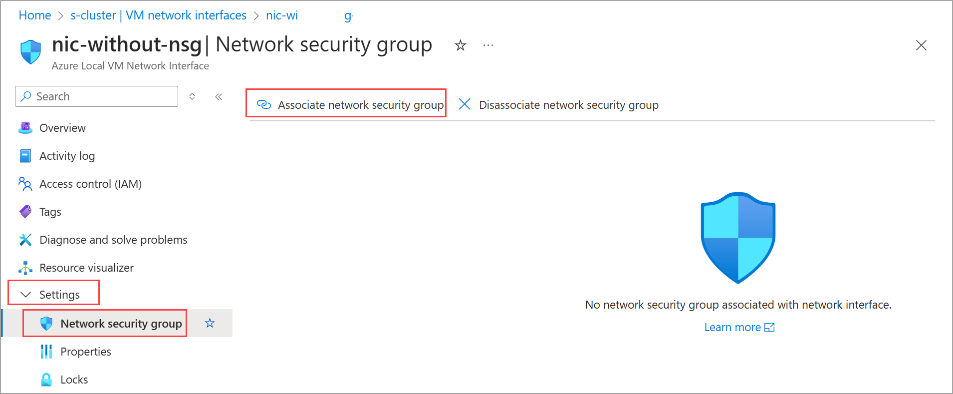 az stack-hci-vm network lnet update -g $resource_group --name $lnetname --network-security-group '""'Expand this section to see an example output.