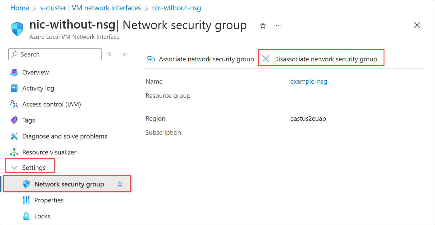 $resource_group = "examplerg" $location = "eastus" $customLocationId = "/subscriptions/<Subscription ID>/resourcegroups/examplerg/providers/microsoft.extendedlocation/customlocations/examplecl" $nsgname = '""' $nicname ="examplenic"To dissociate a network security group from a network interface, run the following command: