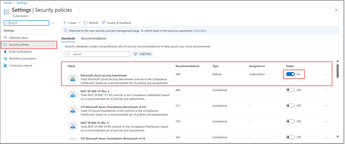 For Microsoft cloud security benchmark, toggle the Status button to On.