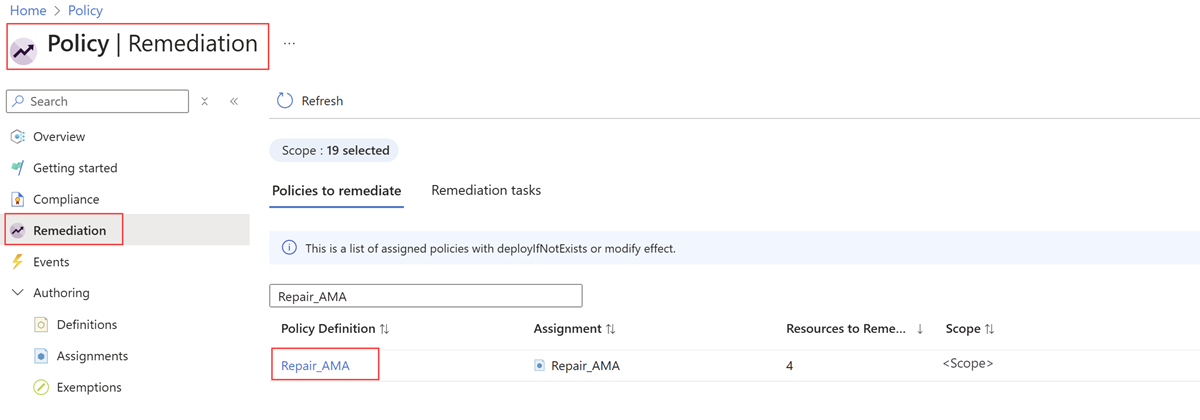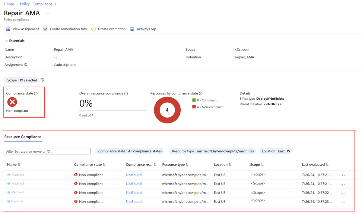 Select the policy assignment name to view the Resource Compliance status. For example, the compliance report for the repair AMA policy shows the nodes that need to be repaired:
