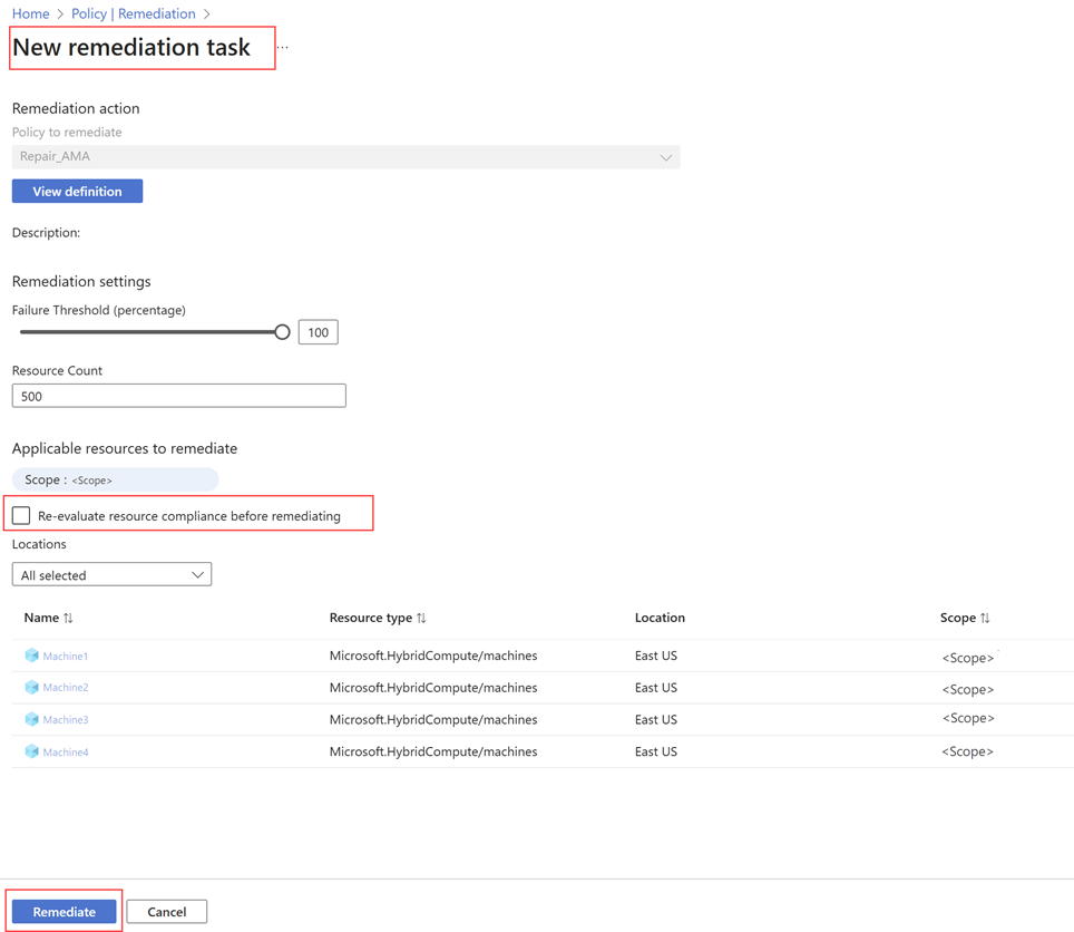 The New remediation task page displays the resources that need remediation. Select the Re-evaluate resource compliance before remediating checkbox and then select Remediate.