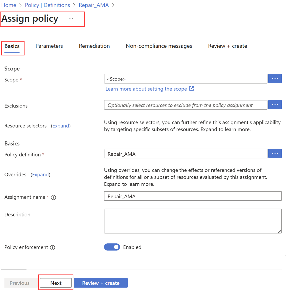 Field Action Scope This field is prepopulated with the scope that you defined during policy definition creation. If you want to change the scope for policy assignment, you can use the ellipsis ( ...) and then select a subscription and optionally a resource group. Then select Select to apply the scope.Exclusions Optional. Use the ellipsis ( ...) to select the resources to exclude from the policy assignment.Policy definition This field is prepopulated with the policy definition name created in the Create a policy definition step. Assignment name This field is prepopulated with the name of the selected policy definition. You can change it if necessary. Policy enforcement Defaults to Enabled. For more information, see enforcement mode. Select Next to view the Parameters tab. If the policy definition you selected on the Basics tab included parameters, they show up on the Parameters tab.
