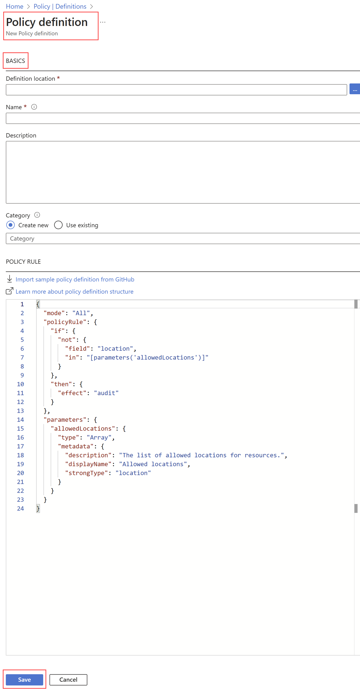 Field Action Definition location Select the ellipsis ( ...) to specify where the policy resource is located. On the Definition location pane, select the Azure subscription and then select Select.Name Specify a friendly name for the policy definition. You can optionally specify a description and category. POLICY RULE The JSON edit box is prepopulated with a policy definition template. Replace this template with the policy definition template you want to apply. For the definition templates for Insights policies in JSON format, see the About using Azure policies to enable Insights at scale section. Role definitions This field is displayed after you copy and paste the policy definition into the POLICY RULE field. Select the Guest Configuration Resource Contributor role from the list. Select Save.
