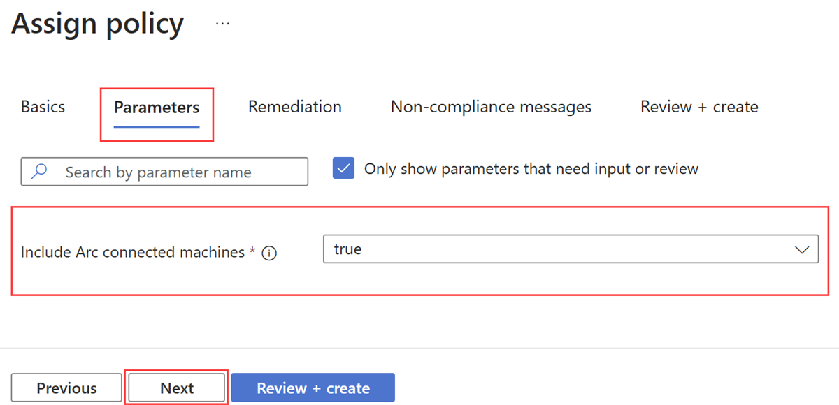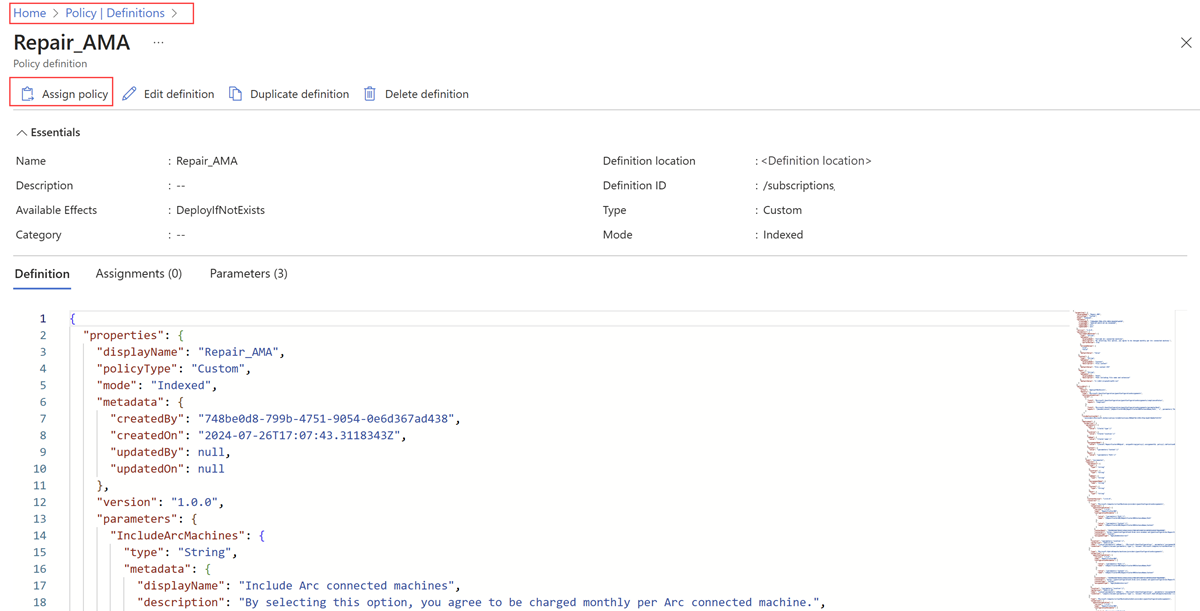 For example, the policy to repair AMA shows the Include Arc connected machines parameter. Select True to include Arc-enabled servers in the policy assignment.