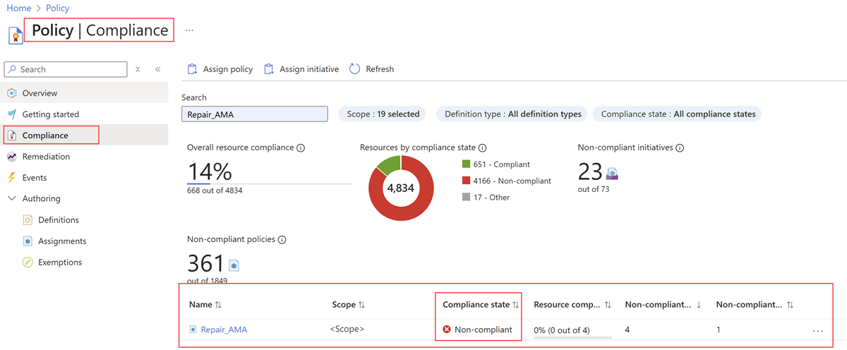 Select the policy assignment name to view the Resource Compliance status. For example, the compliance report for the repair AMA policy shows the nodes that need to be repaired: