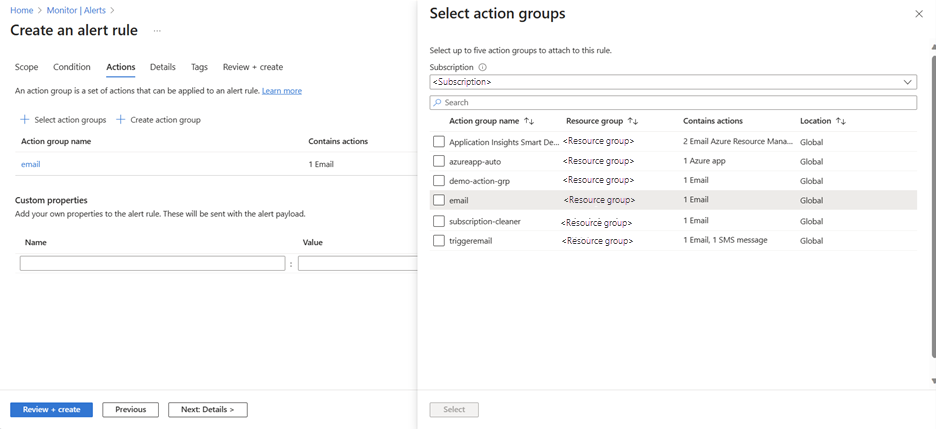 On the Actions tab of the Create and alert rule page, specify the action group to indicate your preferred method of notification, and then select Next: Details >.