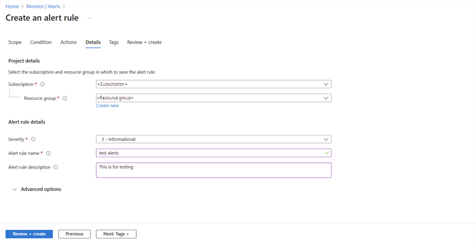 On the Details tab of the Create and alert rule page, select severity and alert rule description. Select Review+Create and then select Create.