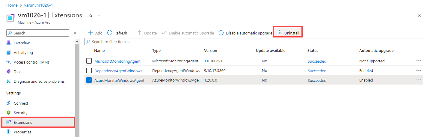 In this example, AzureMonitorWindowsAgent is selected for deletion.