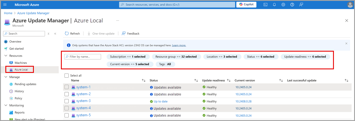 AUM provides a centralized view to apply and manage updates across all Azure Local instances. In the Azure portal, go to Azure Update Manager > Resources > Azure Local.