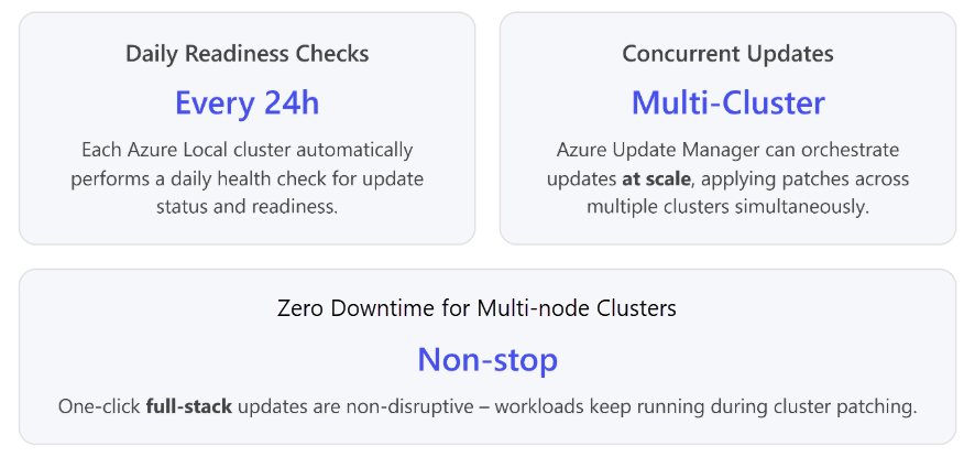 Best practice: Always initiate updates through AUM, which ensures rolling updates, readiness checks, and high-availability. In summary, treat Azure Local as a clustered system and not as standalone servers.