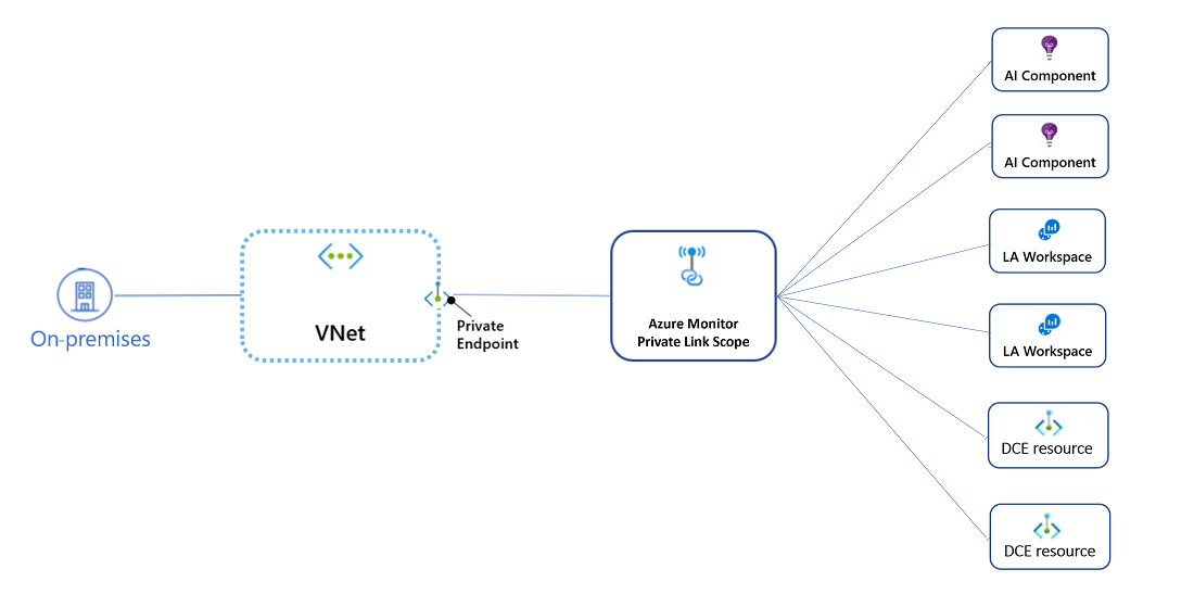 Private links for Azure Monitor are structured differently from private links for other services. Instead of creating a private link for each resource, the VNet connects to, Azure Monitor uses a single private link connection using a private endpoint from the virtual network to an Azure Monitor Private Link Scope (AMPLS). The AMPLS is a set of Azure Monitor resources that define the boundaries of your monitoring network.
