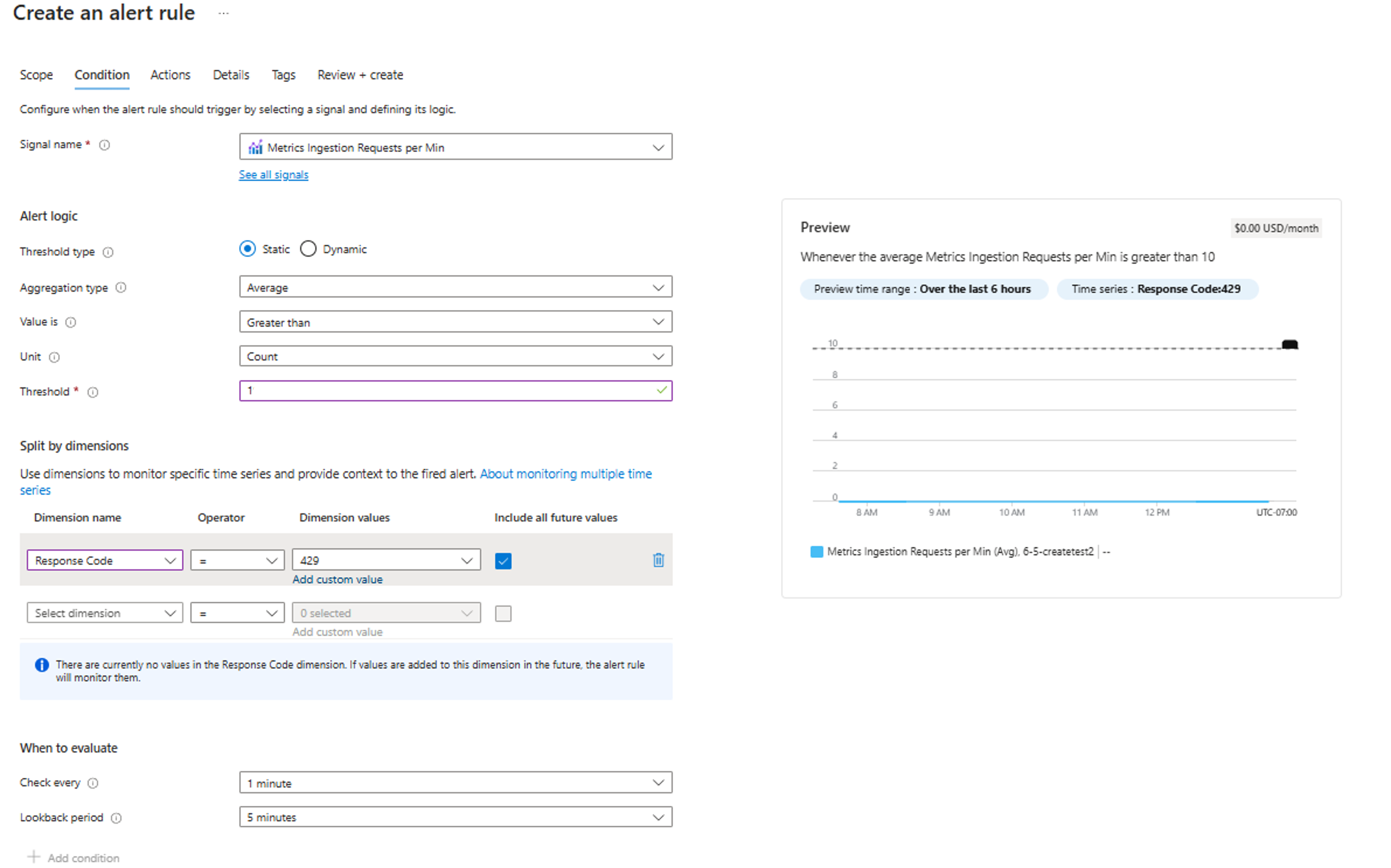 Review the details and enter the threshold; In the Split by dimensions section, select Response code from the "Dimension name" dropdown, and enter "429" as the dimension value.