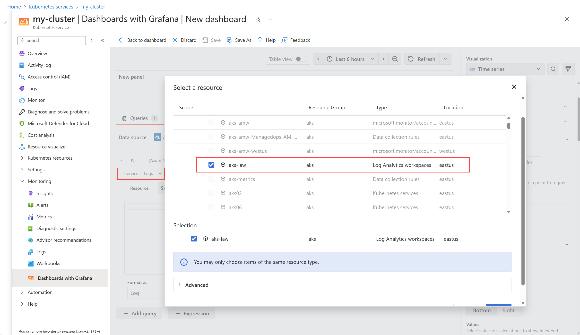 For Container logs, select Azure Monitor. Then select Logs for the Service. Click Select a resource and select the Log Analytics workspace used to collect the container logs for the cluster.