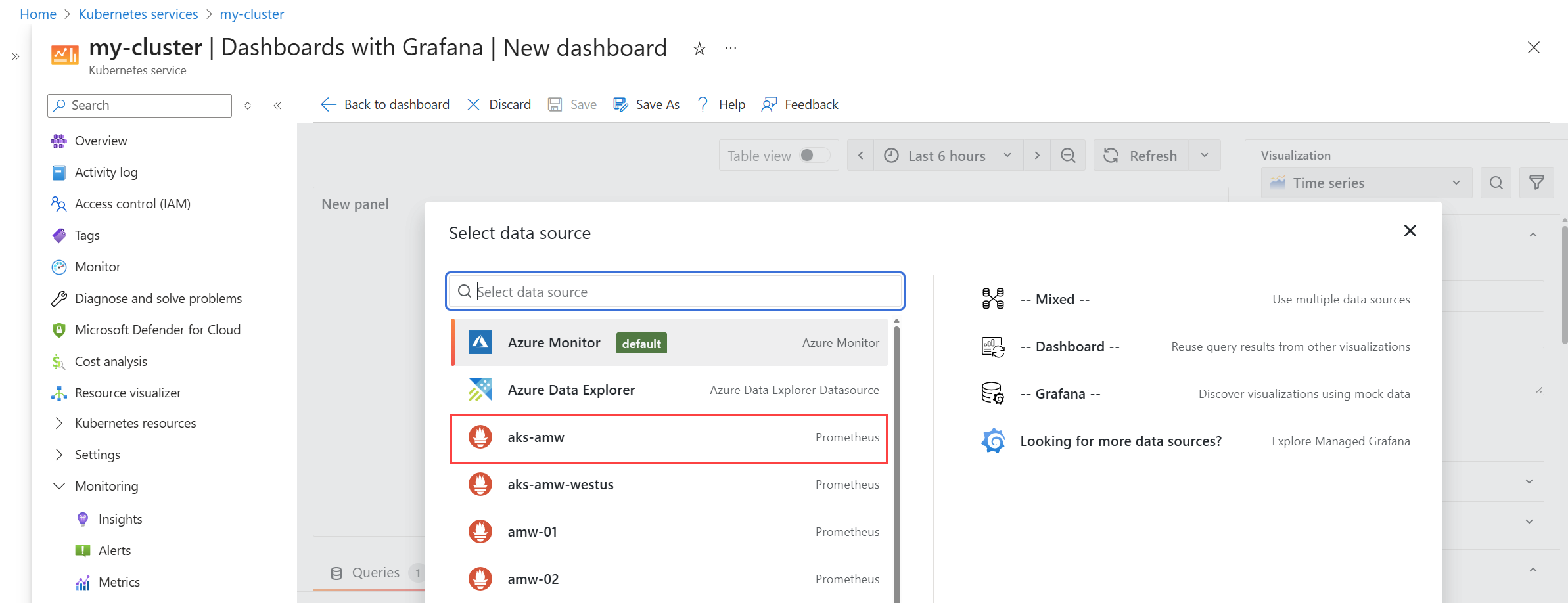 For Prometheus metrics, select the Azure Monitor workspace used to collect the Prometheus metrics for the cluster.