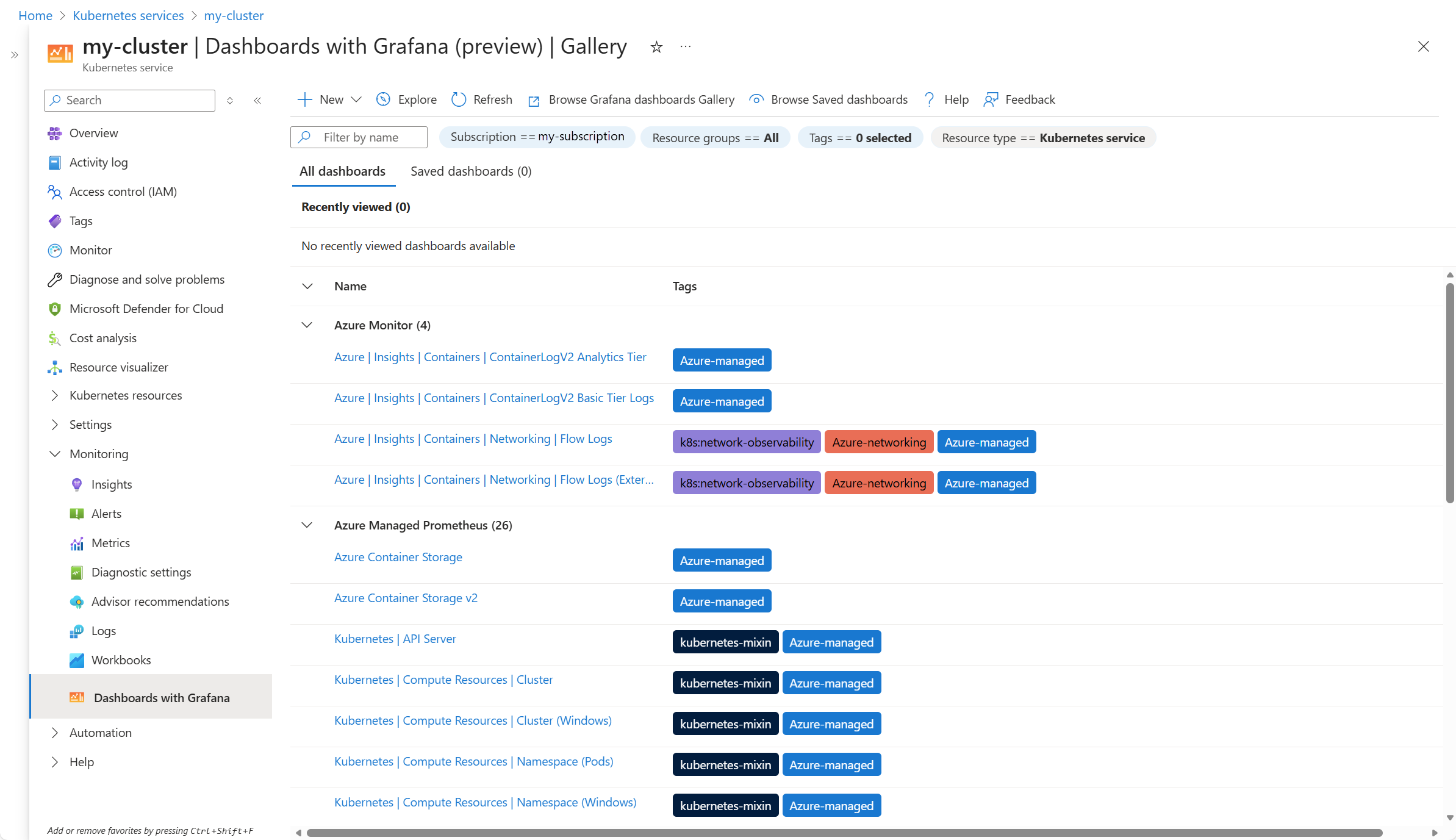 Open dashboards for a particular cluster from Dashboards with Grafana in its Monitoring section in the Azure portal. Only dashboards relevant to that cluster are listed.
