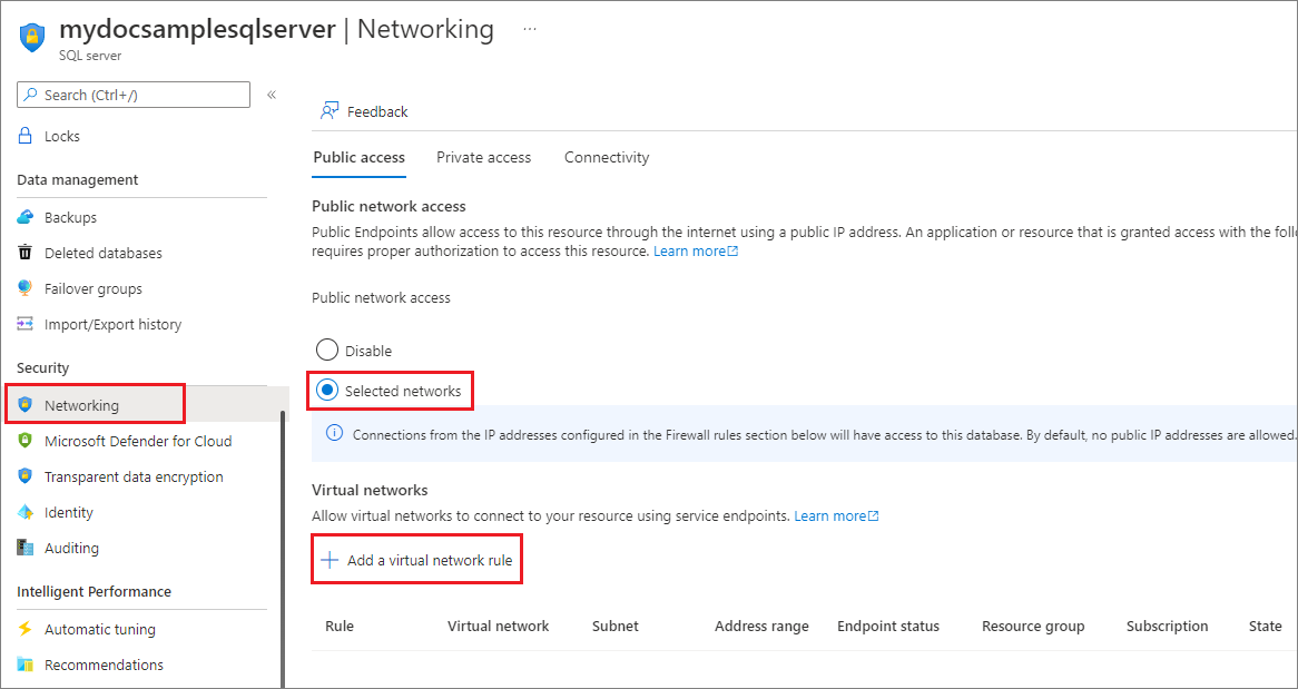 Search for and select SQL servers, and then select your server. Under Security, select Networking.