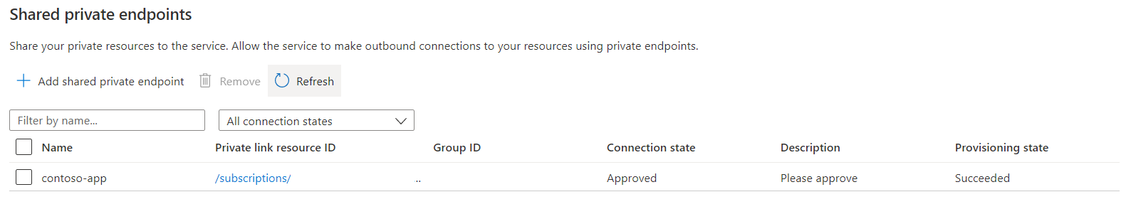 The value for Provisioning state in the shared private endpoint resource is Succeeded. Connection state is Pending until the endpoint is approved at the target resource.