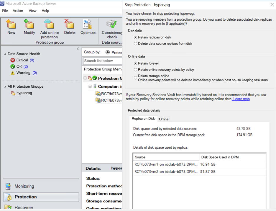 In the Remove from Group dialog box, review the used disk space and the available free space for the storage pool. The default is to leave the recovery points on the disk and allows them to expire per their associated retention policy. Select OK.