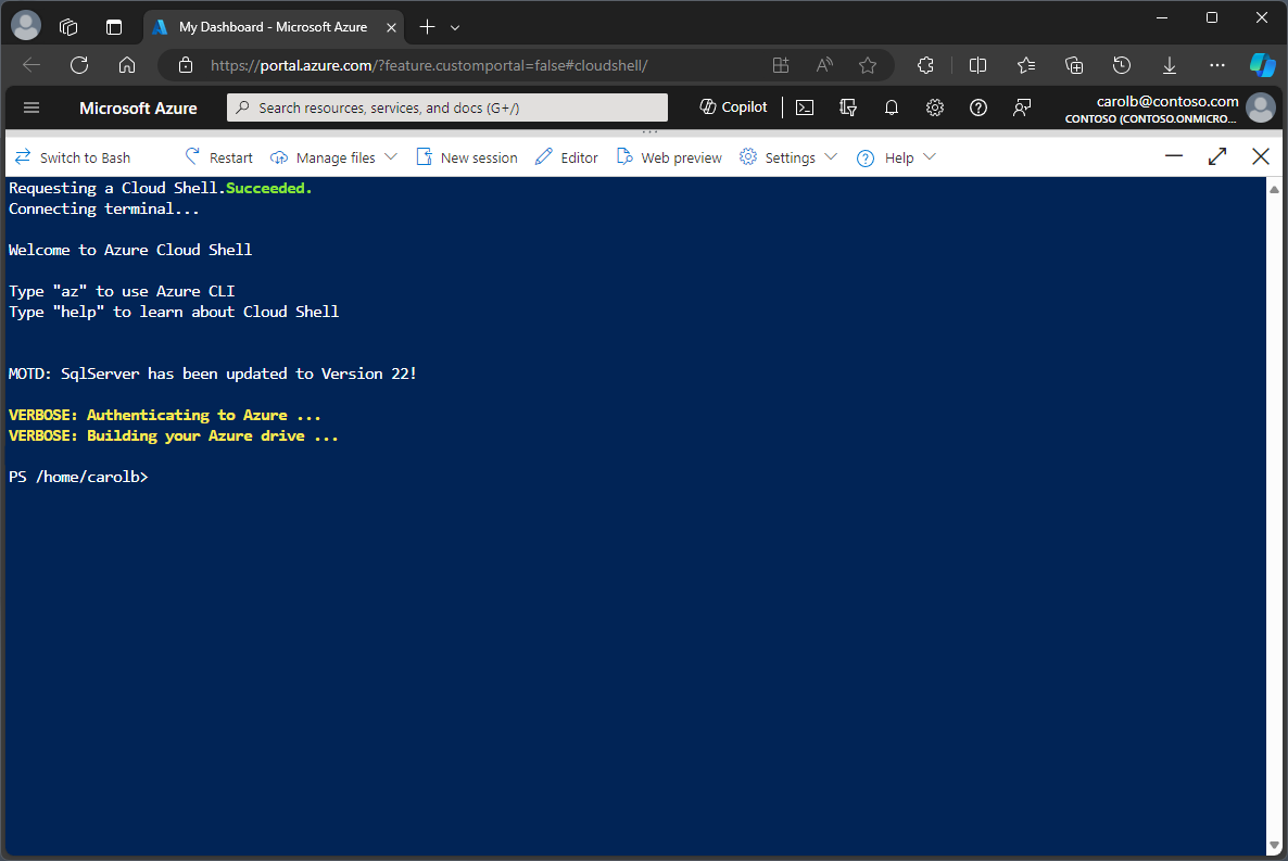 Use the environment selector in the Cloud Shell toolbar to switch between Bash and PowerShell environments. When Cloud Shell is configured to start in PowerShell, the button is labeled Switch to Bash. When Cloud Shell is configured to start in Bash, the button is labeled Switch to PowerShell.
